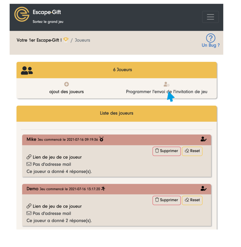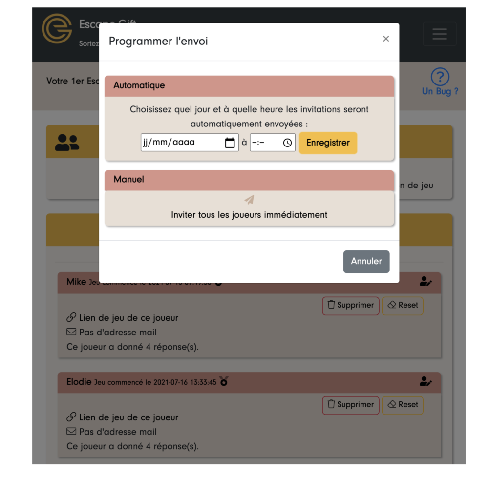 1/ Dans le cas où vous avez ajouté les joueurs vous-même, vous avez à présent accès à la page ci-dessous qui vous permet d’envoyer les mails d’invitation au jeu en un clique ou de programmer l’envoi :