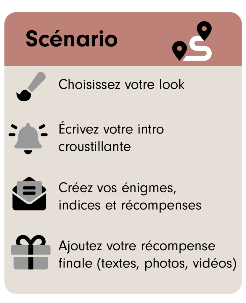 Si vous cherchez l’inspiration, partez d’une de nos suggestions, si vous savez ce que vous voulez, créez votre propre énigme :