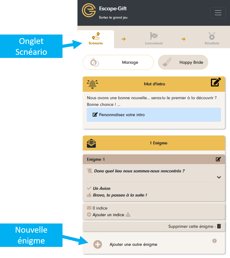 Pour ajouter une énigme, rendez-vous dans l’onglet « Scénario » de votre Escape-Gift et cliquez sur « Ajouter une énigme » :