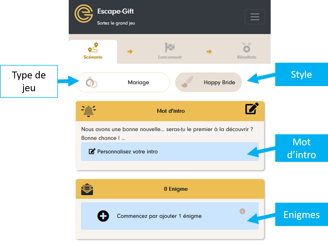 Lorsque vous validez le choix du style, un Escape-Gift vierge est créé dans votre espace personnel et vous pouvez commencer à le personnaliser :