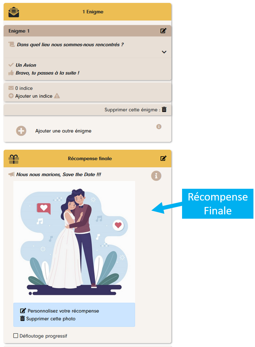 A partir du moment où une première énigme est ajoutée, un bloc « récompense finale apparaît en dessous du bloc énigme :