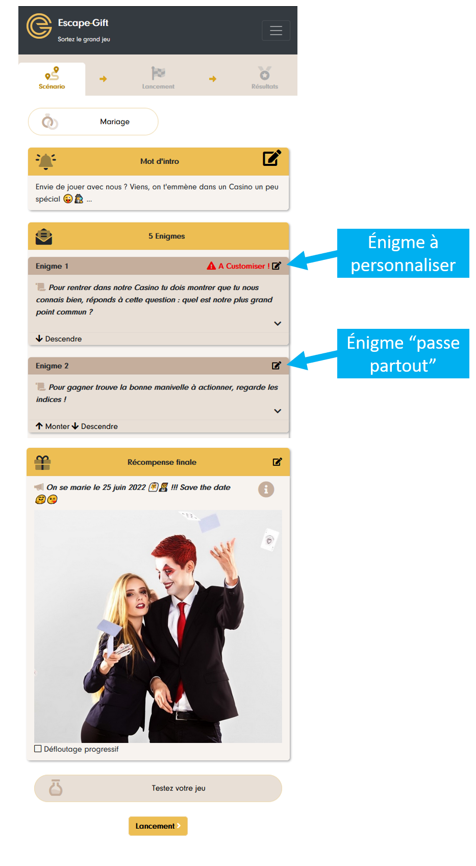 Si vous partez d’un modèle de jeu (scénario à personnaliser), c’est la même logique mais les énigmes sont déjà pré-remplies. Certaines sont « passe-partout », d’autres ont besoin d’être adaptées à votre situation. Nous les indiquons avec un texte en rouge « à customiser ! » :