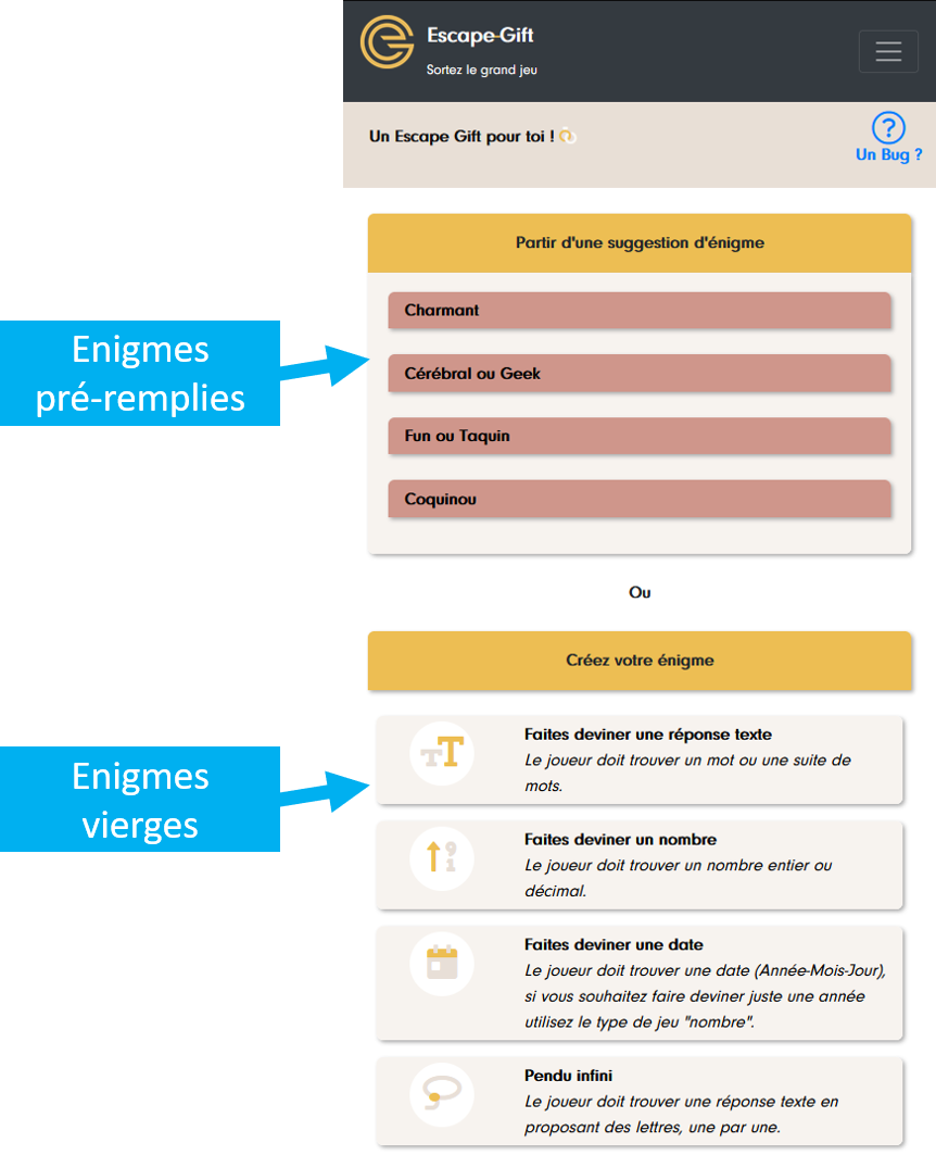 Lorsque vous créez une énigme pouvez partir d’une de nos suggestions. Cliquez dessus pour avoir des suggestions adaptées à votre occasion !