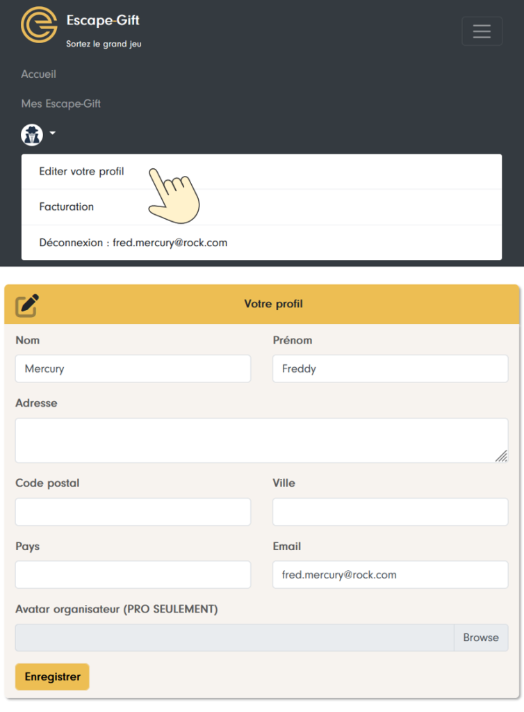 Vous avez accès à votre profil en cliquant sur le menu en haut à droite.