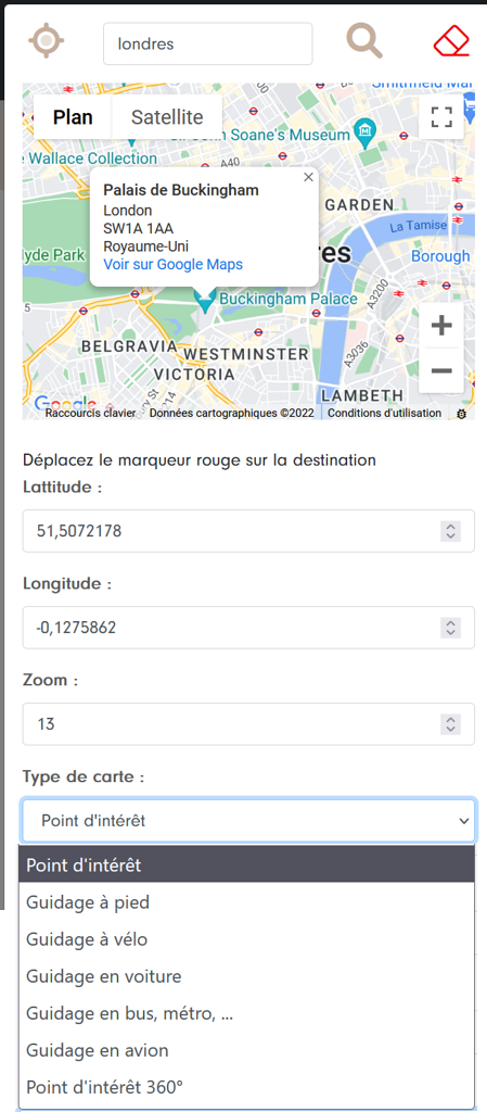Concernant les cartes, vous avez la possibilité de guider la personne vers un lieu ou de l’envoyer vers un centre d’intérêt en mode google map ou google street view (point d’intérêt 360°):