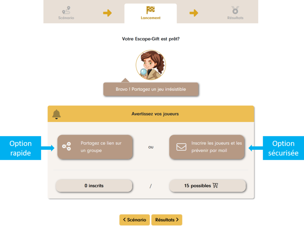 Vous pouvez voir en un coup d’oeil les inscrits et la progression des joueurs sur l’onglet « Résultats » de votre Escape-Gift :